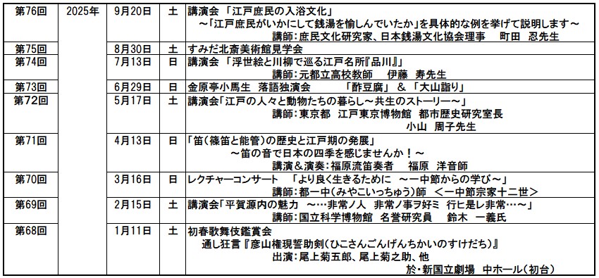 幅広く「江戸文化」全般、特に文化・文政期以降の「町人文化」に触れることを目的とし、あくまでも「趣味を楽しむ会」として会員・会友の知的好奇心を満たし交流を促進する活動を行っています。