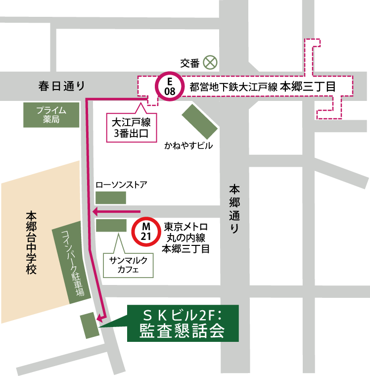 ・東京メトロ丸ノ内線「本郷三丁目」駅より徒歩1分 ・都営大江戸線「本郷三丁目」駅3番出口より徒歩3分 (コインパーキング先のSKビル2階、看板「一般社団法人 監査懇話会」)